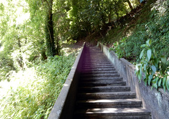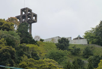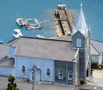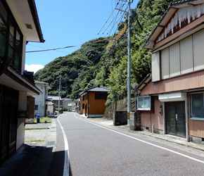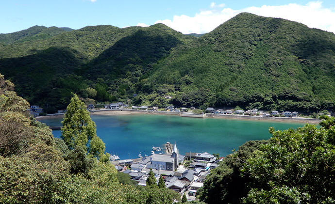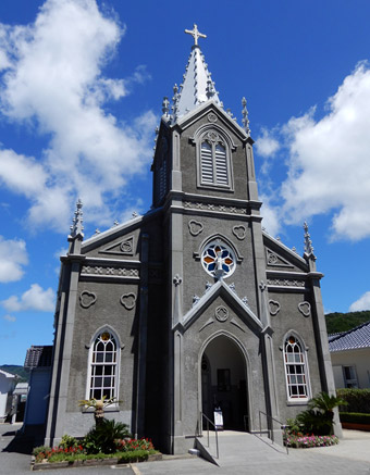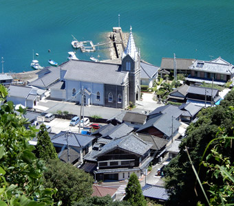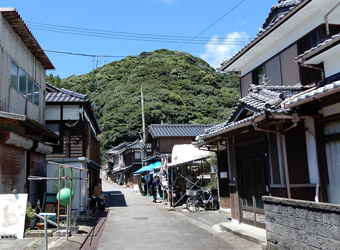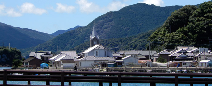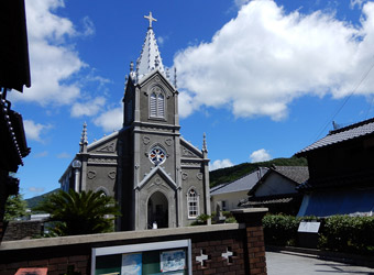 崎津」と書かれた案内標識に目が留まる。自分が記憶する限り、以前は崎津に道の駅は無かった。やはり以前とは様子が異なるようだと、妙な不安が生まれる。交差点を左折すると道の駅だが、とりあえず集落中心にある教会へ向かうため右折すると、そこは崎津集落を通る細道だった。そうだ、以前はこの道を車で通ったんだと思い出したのも束の間、交差点の直ぐ先で係員に車を止められ、観光客は車で通行できない事を告げられる。その道路脇に設けられた駐車スペースは満車で、道の駅に車を停めるよう指示される。元々崎津は観光地としてあまり知られていないマイナースポット(多分)で、「自分だけのとっておきの場所」的な隠れスポットだったが、いつの間にか側を国道が開通し、道の駅ができ、まるでメジャースポットのような感じになっていた。この事実に少なからずショックを受ける。 |