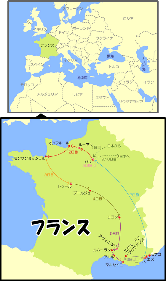ツアー旅行の予約後に旅行代理店から電話が掛かってきて、日程表通りの飛行機の予約が取れなくなってしまい、帰りの飛行機に乗る時間が9日目の夜から朝に変更になり、9日目のパリ1日フリータイムが無くなってしまうとの連絡を受ける。パリの1日フリータイムは楽しみのひとつだったので、最初に予約した9月12日発のツアーをキャンセルして9月8日発のツアーに変更。これにより宿泊先の一部が変わり、モン・サン・ミッシェルが部屋から見える唯一のホテルに宿泊する事になった。そして偶然にも、6年前のイタリア旅行と同じ8日〜17日の10日間の旅行となった。