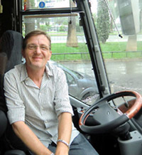 今回のツアー旅行では、旅行6日目まではプレミアムバスを利用。座席が横2席+1席の3列配置で、体も足元もゆったりの快適シート。各席に液晶モニタがあり、バスの前面に設置されたカメラからの映像も見れるちょっと豪華なバス。6日間お世話になる運転手のセルジュさんはとても優しそうな人で安心。事故など起こしたりしなさそうだ。