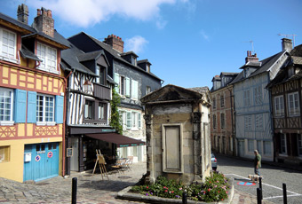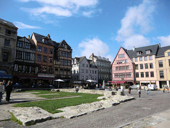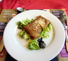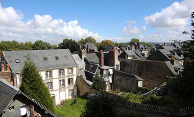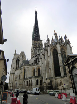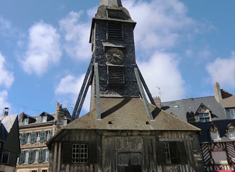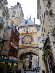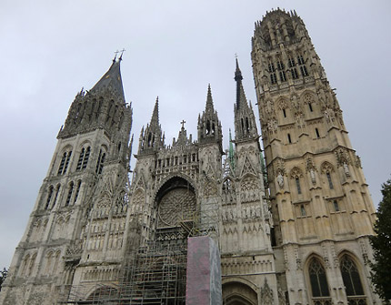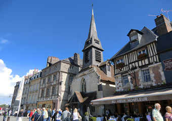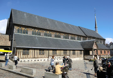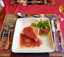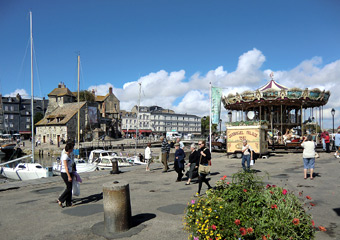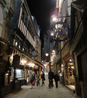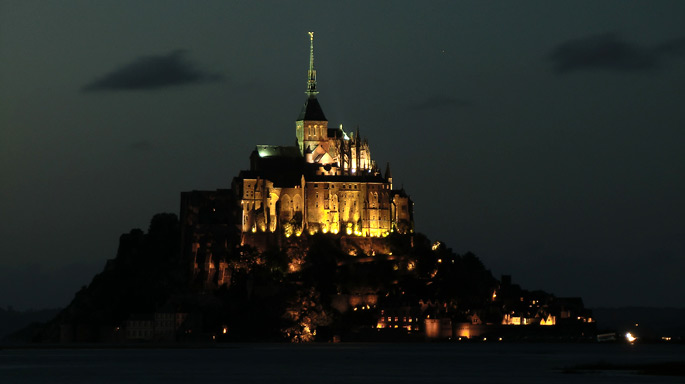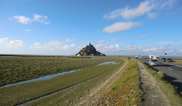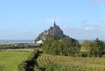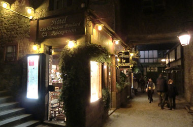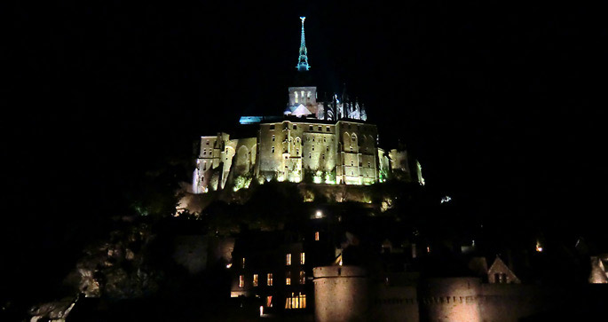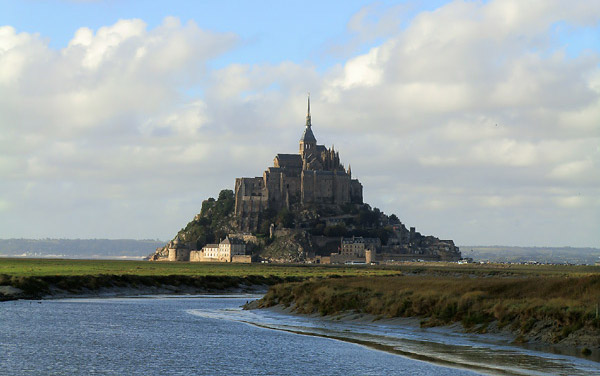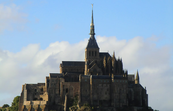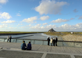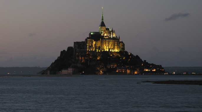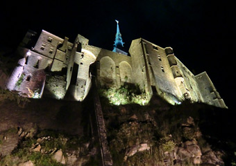 オンフルールから約3時間かけてモン・サン・ミッシェルへ。バスの車窓からモン・サン・ミッシェルのシルエットが遠くに見え始めると、皆窓に張り付くようにして眺め、一同モン・サン・ミッシェルに夢中。そして18:00にホテルに到着。モン・サン・ミッシェルを部屋から眺めることが出来る唯一のホテルらしい。しかし自分が割り当てられた部屋からは、モン・サン・ミッシェルの手前に木が生えていて邪魔している。まぁいいか…どうせ外に出て見物するんだし。夕食まで1時間ほど時間があるので、早速外へ出てモン・サン・ミッシェル見物。 |