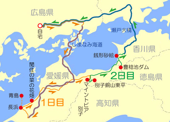 広島からしまなみ海道を渡って愛媛県まで行くのなら、青島観光だけの日帰りでは少々勿体無い。という事で、愛媛県でまだ訪れた事が無く興味をそそられる観光地はないかと探して目に留まったのが、「東洋のマチュピチュ」と呼ばれる別子銅山東平(べっしどうざんとうなる)。マチュピチュという表現が大げさなのは訪れなくとも何となく分かるが、鉱山跡や戦争遺跡などの遺構を観光するのが好きなので、青島観光の翌日に別子銅山東平観光を設定。それと帰りは瀬戸大橋を渡り、瀬戸内海の中心を囲むように走る旅にしたいと思い、香川県の帰路沿いにある観光スポットをいくつかピックアップ。それらは当日の状況に応じて観光する事にした。