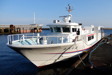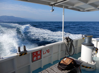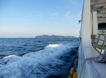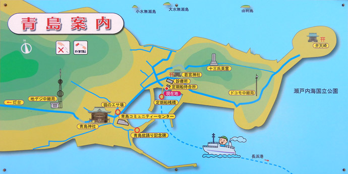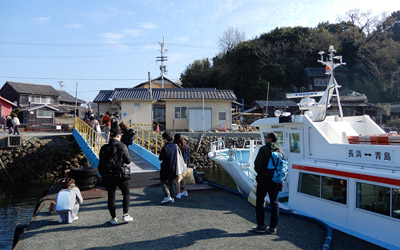 まず、青島観光をするにあたり注意しなければいけないことがある。青島は離島で、愛媛県大洲市の長浜港から定期船に乗って行くのだが、定期船は1日2往復しかしていない。1便は長浜港8:00発の青島港8:35着で、青島港に10分停泊して8:45発の長浜港9:20着。2便は長浜港14:30発の青島港15:05着で、青島港に70分停泊して16:15発の長浜港16:50着。