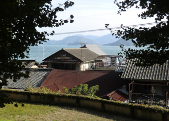 細路地をさらに奥へ進むと石造りの鳥居があり、鳥居から続く石段を上っていくと小さな社が。社のある高台からは、古い町並みの密集した瓦屋根とそのうしろにかすかに見える海と島々。上ってきた石段を見下ろせば、古びた塀や家、電線にまで葉がぎっしり絡みついた風景。何だか時代に取り残されたような空間で、不思議な感覚に陥る。でもこういう場所は嫌いではない。もの寂しさも感じるが、何故か落ち着く。 |