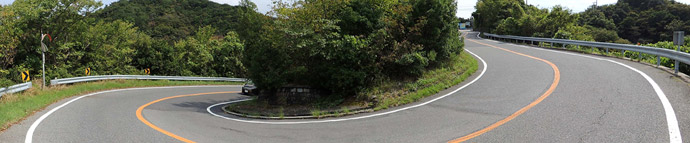 途中3回ほど立ち止まって脚を休めつつも何とか坂を上り切る。それにしても、電動アシスト機能付きのスポーツサイクルに悠然と追い抜かれた時には危うく脱力するところだった。エンジンやモーターなどの動力発生機に頼らず人力のみで急坂を上る事がいかに大変かを思い知らされた。そして残りの難所3ヶ所がどんなにきつい上り坂でも自転車を引いて歩かないと、この時に決めた。洲本より南の県道は車の交通量が非常に少ないので、自分の真横を追い抜いていく車にストレスを感じる事が無いのが幸い。交通量の多い急坂をふらつきながら上るのは危ない。 |