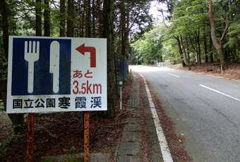 滝見展望台からスカイラインを約3.5km進んだところで、展望スポットの四方指(しほうざし)へ続く分岐路に差し掛かる。急坂を登りっぱなしでクタクタなので、寄り道をして余計に走りたくない気分ではあるが、せっかくここまで登って来たのだし四方指まで500mと近いので、少し考えた末寄り道を決意。 |