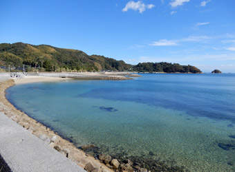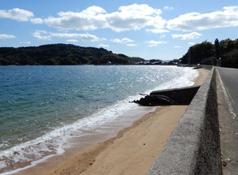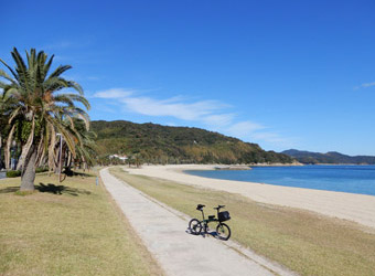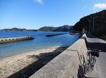 星のビーチから海岸線は南へ向かって続き、それに沿って延びる道路を進んで行く。星のビーチ周辺の海岸やその少し南にある片添ヶ浜海浜公園の砂浜海岸は、海がとても鮮やかな色で透明度も高く南国的な風景にも見える。本当に綺麗な海岸風景が多いのでゆっくりペダルを漕いで進まないともったいない。 |