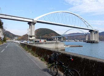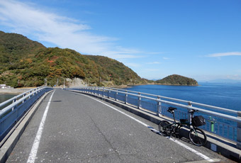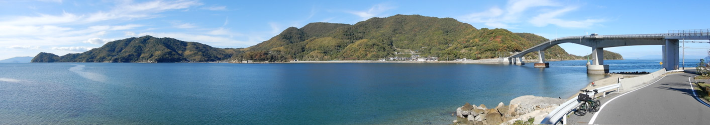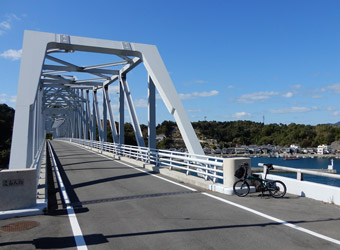 本土と田島を繋ぐ内海大橋の手前にあるパーキングに車を停めてサイクリングスタート。内海大橋はふたつのアーチ橋が「へ」の字型に繋がった特徴的な見た目の橋。内海大橋を渡って田島に入り、低い堤防が続く海岸沿いの道路を時計回りに進む。今更改めて言うまでもないが、島を一周する時いつも時計回りに走っているのは海側の車線を走るため。 |