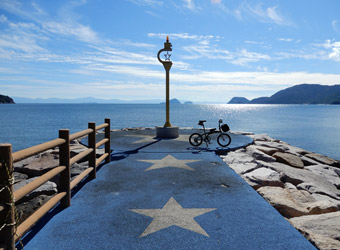 油宇漁港から続く通行止め区間を過ぎたところでオレンジロードを抜けて、南岸沿いの道路に出て星のビーチへ。星型のモニュメントが建つ2つの突堤があり写真撮影にいい場所。ここもロードバイクで訪れてとても気に入った場所だが、スタンドを付けていないロードバイクではイイ感じに写真を撮ることが出来なかった。今回は安定性の高いスタンドを装備した自転車なので、好きなところに自転車を停めて撮影できる。綺麗な風景をバックして愛車を撮るのは本当に楽しい。 |