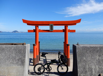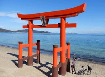 さらに片添ヶ浜海浜公園の少し南には厳島神社の分社があり、本家本元宮島の厳島神社と同じく海に浮く鳥居がある。と言っても訪問時は干潮で砂浜の上に建っていた。ちょうどいいので砂浜へ下りて記念撮影。前回訪れた時は豪雨の影響で鳥居の一部が壊れていたが、しっかり修復され鮮やかな朱色の鳥居に生まれ変わっていた。ここも周防大島サイクリングには外せないお気に入りスポット。 |