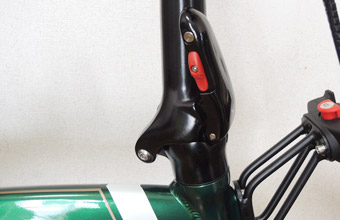 で、ギシギシカチカチキリキリ音の原因は何なのか、自力で原因を突き止めるのは無理なのかと半ば諦めつつ、もう一度ヒンジレバーを疑ってよく観察し、フレームのヒンジレバーがロックしていない状態だと上下に遊びがありガタガタ動くことに着目。で、試しにレバーを上に押しながらロックしたところ、異音がピタリと止んで暫く走っても音は出なくなった。今度はレバーを下に押しながらロックをすると、最初は異音が無いものの走っているうちにギシギシ音が出始める。結果として異音の原因は、フレームのヒンジレバーの微妙な上下位置によるフレームとの干渉、という事になる…多分。これは他の個体でも起きるものなのだろうか、それとも自分の個体だけたまたま発生したのか気になるところだが、とりあえずは自力で原因を突き止め異音を解消することが出来てよかった。 |