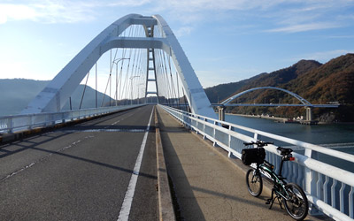 倉橋島北部の道路は車の往来が非常に多い上、路側帯が狭く自転車での通行に向かない区間も多い。対して南部は交通量が少なくサイクリングに向いた道路環境で、海岸線に沿って走れる区間が多く瀬戸内風景を満喫できる。倉橋島南部はミニベロでポタリングするのにちょうどいいコースだと改めて実感できた。 |