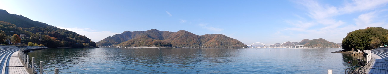 << SCROLL 沖家室島から見る周防大島と沖家室大橋 パノラマ写真180° SCROLL >> |