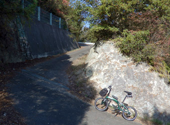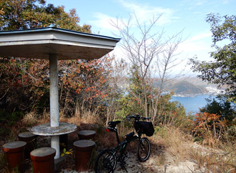 クレセントビーチ海浜公園を出たら細い山道に入り、田島東部にある内浦山の山頂部にある内浦憩いの森公園まで登る。思っていた以上に急勾配の多い山道で、約2kmある道のりの半分近くを自転車を押して歩く事に。ロードバイクじゃないんだから無理してペダルを漕ぐ必要なんて無いね!…しかし急勾配の上り坂を自転車を押して歩くにしても、いろんなパーツを付けて重くなったミニベロよりもずっと軽いロードバイクの方が楽であることを痛感させられる。 |