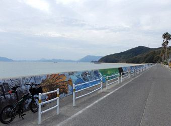 横島南岸にある横山海岸海水浴場まで進むと、道路と砂浜を隔てる堤防に子供が描いたと思われる絵がズラリ。ここは晴れていればとてもいい雰囲気の場所だが、曇り空で周囲の景色は灰色掛かっていて冴えない。まぁ、ここを訪れるのは3度目で1度目と2度目は天気が良かったからいいさ。 |