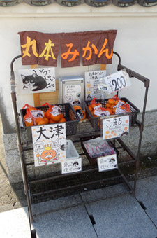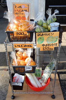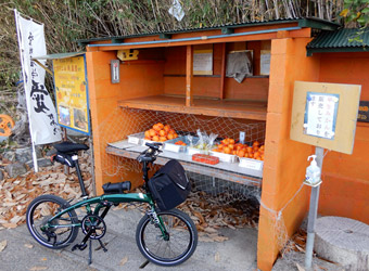 いつも通り本土に車を停めて自転車で安芸灘大橋を渡り、とびしま海道西端に位置する下蒲刈島に入る。松濤園がある石畳の通りに入ると、早速複数の無人販売場を見掛ける。みかんだけでなくレモンや野菜も販売中。でも買うのはまだ。今回は岡村島までの往復60kmを走るので、荷物となるみかんを往路で買う必要はない。それに何処でみかんを買うかは何となく決めていた。 |