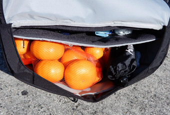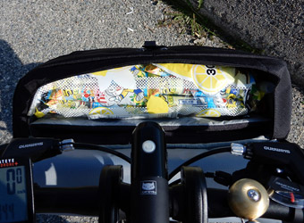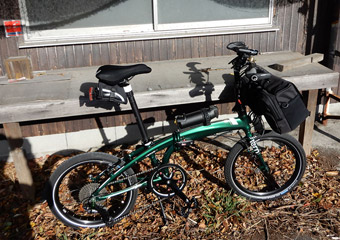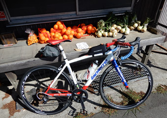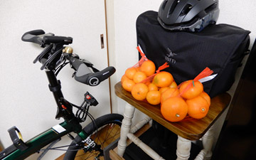 フロントバッグには三脚やコンビニで買ったおにぎりなどを入れてあるが、それでも余裕を持ってみかん3ネットを詰めることができた。あと1ネットは入りそうだが、あまり詰め過ぎると車重増で上り坂が辛くなりそうだし、そもそもコーヒーのお釣りでつくった100円玉はみかん3ネット分の購入で無くなった。みかんを詰め込んだフロントバッグを自転車から外して持つと結構な重さ。再びバッグを装着して自転車を持ち上げるとかなりの重さ。。ともあれ、このフロントバッグは本当に役に立つので買って大正解。 |