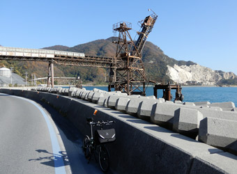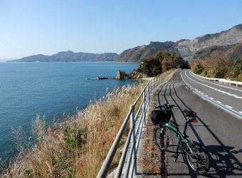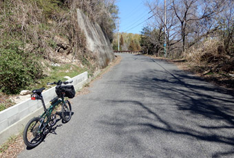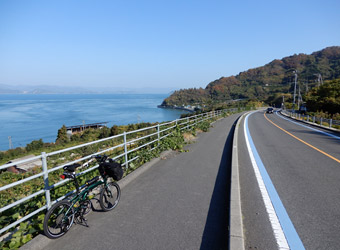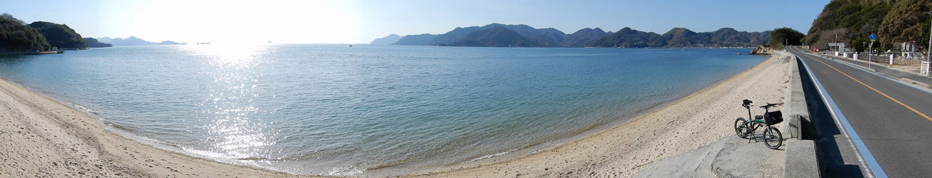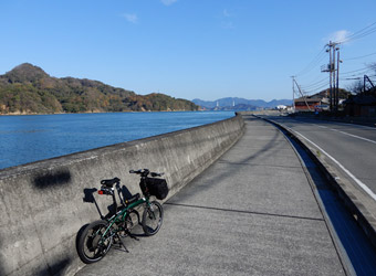 因島東岸沿いの道路は曲がりくねってアップダウンを繰り返す道が暫く続く。そういえばロードバイクで走った時も結構しんどかったなと思い出す。ロードよりも走行性能が低く車重の重いミニベロなので余計しんどい。冬の出不精で身体が鈍り切っているので尚更しんどい。それでも快晴下での久しぶりのサイクリングなので気分はいい。 |