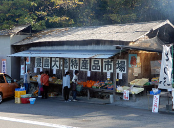 豊島大橋を渡って豊島へ。橋から海岸沿いの道路まで続く長い坂道の途中には有人の販売所。10年くらい前にとびしま海道をドライブをした時に、ここでみかんを買った記憶がある。ロードバイクで下ると50km/h以上出る坂道でいつもすっ飛ばしていたが、今回はミニベロなので歩道に入りゆっくりと。 |