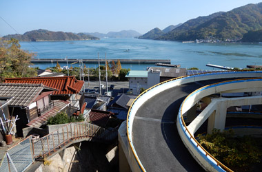 豊島にある公園で何やら催し物が行なわれていて賑わっていた。いつもよりも明らかに車の交通量が多いとサイクリングスタート時から思っていたが、どうやらそれが原因のよう。騒がしい場所は避けたいので人だかりを横目に公園を素通りし、コースから一歩外れた所にある小さなループ橋に寄り道。こういうちょっとした隠れスポット的な場所が好きだ。 |