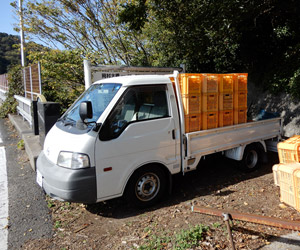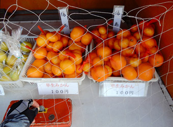 岡村港の自販機でホットコーヒーを買って小銭をつくり、その場でコーヒーをグビッと飲み干してからお目当ての無人販売所へ戻る。この販売所は以前お世話になったみかん農園がやっているので、今回ここでみかんを買おうと思っていた。で、販売されていたみかんは200円のネットとキズあり100円のネットの2種。200円のネットは残りひとつだけだったので、それと傷あり2つの計3ネットを購入。キズありと言っても皮にちょっと付いているだけなので無問題。いずれにせよ近所のスーパーで買うよりもずっと安い。 |