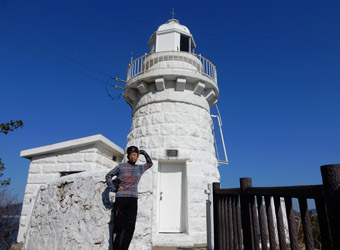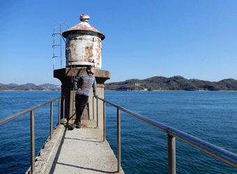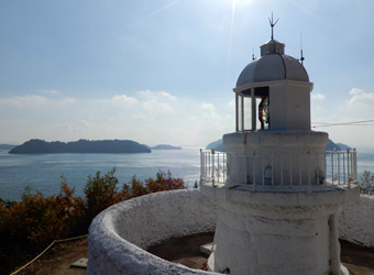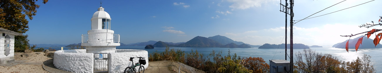 いつもの大崎上島サイクリングと同じように海沿いの道路をのんびりと進んで行き、島の南東部にある中ノ鼻灯台へ。ここが大崎上島で一番のお気に入りスポット。円形の塀に囲まれた小ぶりな白亜の灯台が何ともオシャレでかわいらしい。岬の高台に建つ灯台からの眺めはまぁまぁ。 |