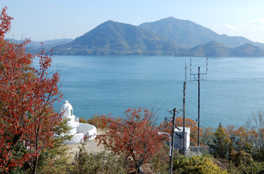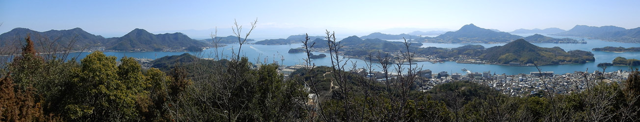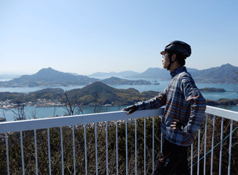 テレビ塔からも周囲の景色を一望できるが、すぐ側にある展望台の方が視野が広くもっと眺めがいい。展望台は南西側を向いていて、正面に生名島とその後ろに岩城島、左隣に佐島に弓削島と、ゆめしま海道四島を一望できる眺め。半年前にミニベロでゆめしま四島を全て一周した時の走行距離は65kmだった。マイペースで走ればミニベロでも無理のないコースと言えるが、天狗山展望台に立って視界に広がる四島を眺めていると、これだけの範囲を小径車でよく走ったものだなぁと感心してしまう。 |
