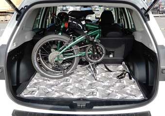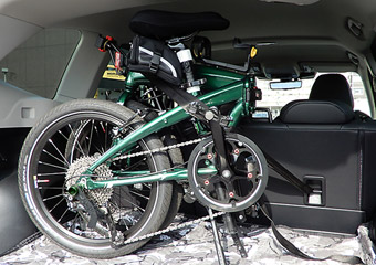 前マイカーのプリウスは外観から想像する以上にラゲージスペースが広く満足だったが、屋根が低くVerge N8を折り畳んで立てた状態で車載することが出来なかった。かと言って折り畳んで寝かせると自転車各部に負荷が掛かりそうで避けたかったので、折角の折り畳み自転車を展開した状態で寝かせて車載していた。要するにロードバイクと同じ車載方法。しかし、ロードバイクの約1.5倍も車重があるVerge N8を展開状態で寝かせて車載するのは結構不便だった。 |