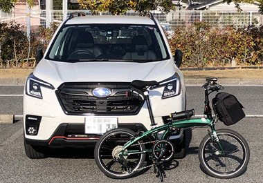 そんな訳で、次のマイカーは折り畳み自転車を折り畳んだ状態で立てて車載できる車がいい!という事もあり、屋根の高いSUVにしたかった。フォレスターならラゲージスペースの室内高が88cmもあるので、折り畳んだVerge N8を立てて載せられる。自転車は車の運転中に動かないようラッシングベルトでしっかり固定。うん、完璧だ。 という事で、これからはフォレスター x-breakとVerge N8の2台で趣味も日常も楽しんで行きたい。 |
