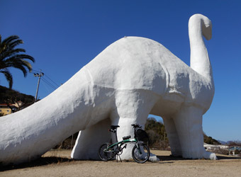 駐車場から向島西岸沿いの道路を少し走り、自転車・歩行者道に入って長く緩い坂道を上って因島大橋へ。はっさく大福の直売店であるはっさく屋は因島大橋のたもとにある。なので橋を渡って因島に入ったところで早速はっさく屋へ向かう。その途中に大きな恐竜像(実物大?)がある公園につでに寄り道。白一色のせいか大きさの割に存在感が無いなぁと、しまなみ往復サイクリングで通り掛かるたびに思っていた。 |