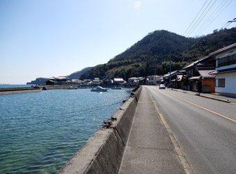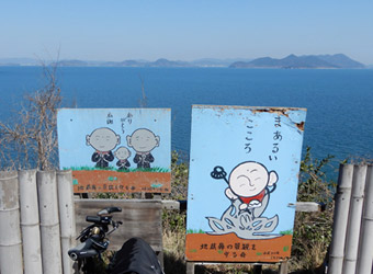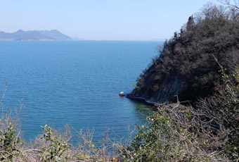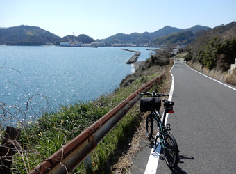島の東岸に回り込むと対岸に大三島の陸地が広がる風景が続く。大三島一周もなかなかいいサイクリングコースだと2ヶ月前に走って再認識した。海沿いに道路が続く島のサイクリングは本当に気持ちがいい。快晴日に多島美を眺めながらの瀬戸内サイクリングは最高のリフレッシュになる。何度も訪れて一時的に飽きる事があっても、やっぱり何度見ても瀬戸内の多島美風景はいい。 |