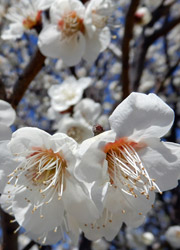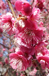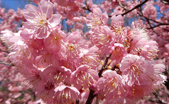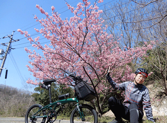 はっさく屋から因島東岸沿いの道をマイペースで南下して行き、島の南東端にある地蔵鼻まで続く道に入ったところで、鮮やかなピンク色の花を咲かせる木に目が留まる。遠目から見た時は梅の花かなと思ったが、花びらの形からして桜に間違いない。3月頭という時期を考えると河津桜だろうか、多分そうに違いない。2月から3月にかけて開花する早咲きの桜だ。花の知識がほとんど無い自分ではあるが、2007年2月に行なった伊豆半島一周旅行で河津桜の名所を観光したので知っている。やはり花の名前と知識もある程度知っていた方が観光を楽しめるなと思った。 |