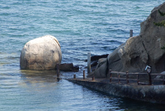 地蔵鼻の名所になっている海岸の丸い大岩は、海側を向いた面に地蔵の絵が彫られていて、干潮時のみ海側に回り込んで地蔵を拝められるようになっている。で、大岩まで続く遊歩道の入口の少し手前に、道路から大岩を眺められる場所があるのだが、残念ながら干潮ではなく大岩の周囲は海に沈んでいた。3年半前にロードバイクで訪れた時も干潮ではなかったし、2013年にドライブで初めて地蔵鼻を訪れた時も干潮ではなかった。これまでに3度訪問して1度も地蔵を見られないという結果に。ちょっと悔しい。でもイチイチ干潮時間を調べてそれに合わせて行くのも面倒くさいし…多分もう地蔵鼻へは行かないっっ |