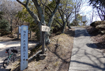 因島南端まで進んだところで、眺めのいい展望台がある天狗山の山道に入る。3年半前にロードバイクで因島一周した時は天気予報が外れて曇り空だったため、満足な展望は望めないだろうと行くのを止めてしまった。今回は雲ひとつない快晴なので絶好の展望日和だ。天狗山展望台へは2013年にドライブで1度訪れたきりで、自転車で行くのは今回が初めて。約1.5kmある山道はそれなりの勾配があり、総重量15kgオーバーの小径車で登るのはかなりしんどい。キツイ急勾配では無理せず自転車を降りて押して歩く。正直かなりクタクタ。 |