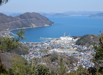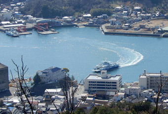 展望台からは因島と生名島の向かい合った港を繋ぐ航路もよく見える。500mも無い狭い海峡なので橋を架ければいいのにと毎度思う。しまなみ海道の因島とゆめしま海道の生名島が橋で繋がれば、島民にも観光客にも利便性が格段に良くなるのは間違いない。きっと大人の事情とかいろいろあるのだろうなぁ。 |
