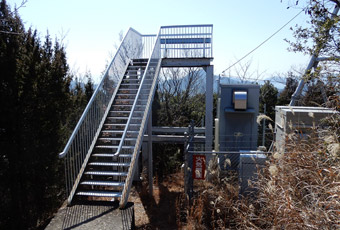 天狗山駐車場に着いたら遊歩道を歩いて山頂へ。遊歩道も急勾配で疲れた足にはしんどい。遊歩道からは地蔵鼻がある南東側の景色を眺望できる。それを見て結構高いところまで登ってきたんだと実感。駐車場から程なくしてテレビ塔が建つ天狗山山頂に到着。 |