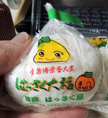 みかん・レモンの他に瀬戸内ならではの食べ物は無いか、できれば果物続きで行きたいなと検索して出てきたのがはっさく。しまなみ海道六島のひとつである因島ははっさくの発祥地と言われていて、名物である「はっさく大福」を直売している「はっさく屋」という店がある事を知る。という事で、買物サイクリング3回目は”はっさく”大福を買いに因島へ。 |