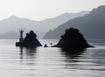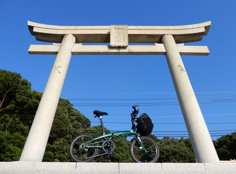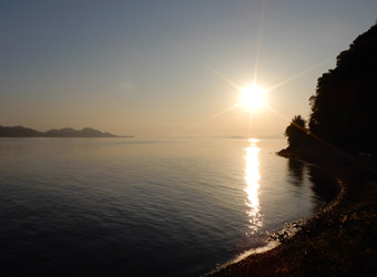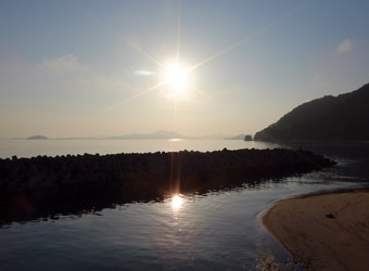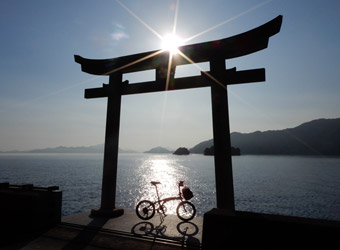上蒲刈島北東端付近にある日高神社の海岸に建つ鳥居は、毎度毎度立ち寄るたびに逆光でいい写真が撮れないスポットだったが、今回は海面に反射した太陽光と鳥居の上から覗く朝日の光が、逆光で黒いシルエットになった鳥居と後ろの風景を際立たせていて、なかなか絵になる写真が撮れた。テンション上がるね早朝サイクリング! |