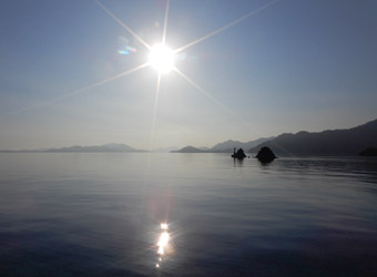 東西に長い上蒲刈島の北岸沿い道路に出ると、すでに日の出を迎えていて眩しい朝日が顔を出していた。期待通り周囲の緑は朝日を浴びて黄みがかり、道路にはガードレールや木々の長い影が伸びていて、早朝らしい風景になっていた。日の出時刻の前後から走り始める早朝サイクリングをした事はほとんど無いのでとても新鮮な気分。少しでも暑さを凌ぐための早朝スタートだったが、朝日を浴びた風景という思わぬ収穫を得た。ちなみに6:00前でも湿気でジメジメベタベタして不快指数は高い。 |