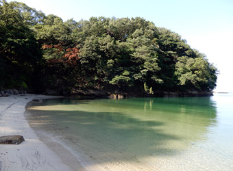 東岸から南岸へと回り込み、海水浴場になっている県民の浜を通過。時間は8:00になるところでまだ人の姿は無いが、いずれ海水浴客で賑わうのだと思われ。正直自分も海に入りたい気分だ。そういえば自分は海よりプール派だった。それにしても夏に水遊びをしなくなって10年以上経つな… |