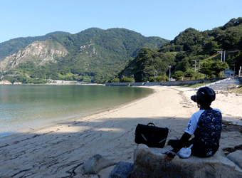 県民の浜の近くにある別の砂浜海岸に出て写真撮影&食事休憩。8:00を過ぎると太陽はだいぶ高くなり本格的な炎天下に。豊島まで走ろうかずっと迷っていたが、この暑さでは後悔する事になりそうなので止めた。その代わりに復路ついでに下蒲刈島をサクッと一周しようかと考えたが、やっぱりそれもしんどい事になりそうなので止め。これ以上猛暑の中サイクリングを続けても楽しくない。 |
