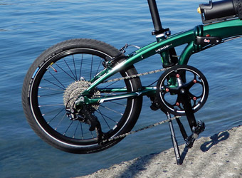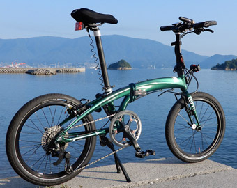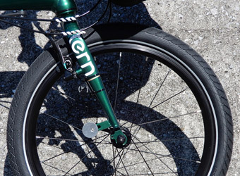 ロードバイクの次の愛車となったミニベロ「Tern Verge N8」は、たまたま店頭で目にしたメタリックグリーンのフレームカラーに惹かれて購入したようなもの。そのフレームは朝日を浴びると黄みがかった深みのあるグリーンになり、さらに綺麗になる。Verge N8には6色も設定色があるが、この色を選択して本当によかったと思う。趣味で乗る自転車は見た目の満足度が性能以上に重要だ。 |