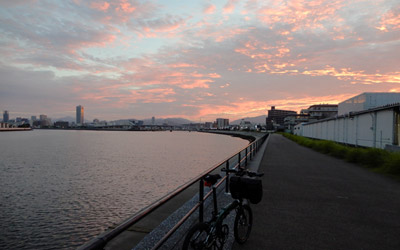 9月に入っても真夏の暑さが続く日々。それでもやっぱりサイクリングに出掛けたい。なのでまた早朝からのスタートにして、コースは自宅から1時間以内の場所で、そして最近走っていないコース…そんな条件で思いついたのが広島市内の川沿いサイクリング。1年前の10月に初めて走ったきりだったので丁度いい。4:30に自宅を出て、1年前と同じく広島港の隣にある広島みなと公園のパーキングにマイカーを駐車して、5:20にサイクリングスタート。 |