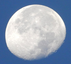 広島みなと公園から直ぐの元安川に出ると、視界一面に空が広がり東側の雲が朝焼けに染まっていた。この日は雲の多い晴れの予報だったが、空一面に灰色の雲が広がるような曇天でなければいいやという気分だった。快晴で真夏の日差しを浴びっぱなしなのも辛いし。それから西側の空には白い月がくっきり。久し振りにデジカメで月をズーム撮影してみる。6年前に3万円で買った安価なコンデジながらも、光学35倍ズームの手持ち撮影でくっきり月が撮れる性能があるし、液晶画面のスイング機能が便利でお気に入りのデジカメなのでまだまだ現役。 |