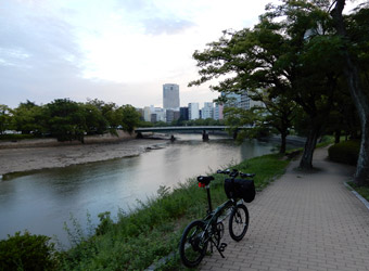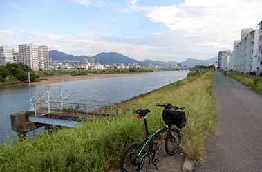 広島城から再び川に出て、歩行者自転車道になっている河川敷を上流へ向けて進む。ここでもジョギングや犬の散歩などをする人が多く、自転車の往来も非常に多くロードバイクに乗ったサイクリストの姿も目立つ。そしてやっぱり気分は乗らないまま。サイクリングに出てここまで気分が乗らない事は今までに無かった、と思うくらいに全然気分が乗らない。やはりコース選択を誤ったのだろうか。建物がひしめく街の風景と単調な河川敷道路が続き、そして人の姿が非常に多い。そのような場所よりも自然に囲まれた瀬戸内の島々をサイクリングした方が楽しいのは間違いない。 |