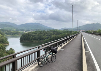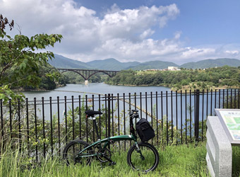 ダムから道の駅の前を通る国道に出て、ダム湖の中心に架かるしゃくなげ大橋を渡り、イベント会場となる駐車場の前を通過。準備中のスタッフがミニベロに乗る自分に気付き両手を大きく振ってくれたので、こちらも振って返す。その先で県央の地まで続く道に折れ、暫く進んで行くとセンターラインの無い細道になり上り勾配が続く。 |