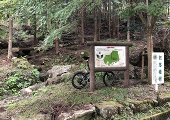 グーグルマップのストリートビューで事前に山道の様子を確認していたが、思っていた以上に急勾配な区間があり辛くて息が切れる。そして途中で顔が汗まみれになっている事に気づき、多めの水分補給をして休憩。快晴で日差しが出ていたら熱中症の危険があった、やはり曇りで正解だった。夏に自転車で山登りなんてするもんじゃないと痛感。あとどれだけ走れば着くのかスマホで確認しようとするも、山の中腹は圏外だった。急勾配と暑さに心が折れそうになりながら、そしてこんな山道を走ろうと決めた事を少し後悔しながら重いペダルを漕ぎ続け、案内板が立つ県央の地の入口に到着。 |