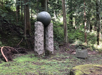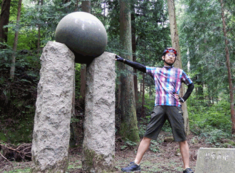 道路脇にある案内板からは木々が生い茂って薄暗い山道を歩く。豪雨の影響か少々道が崩壊してるので心配したが、直ぐにモニュメントが立つ開けた場所に到着。2本の石柱の上に石の球体が載ったこのモニュメントは、いったい何をイメージしてデザインされたのだろう。まぁいい、とりあえず広島の中心点に立つ事ができて満足だ。道のりは険しかったしモニュメント以外何も無いがとりあえず満足だ。 |