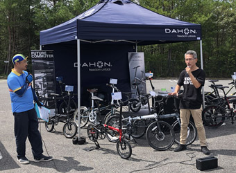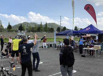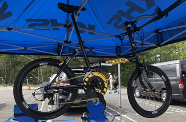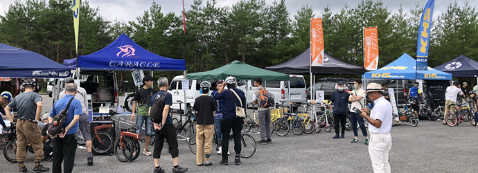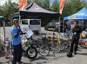 県央の地から道の駅に戻ったところで時間はちょうど10:00。イベント会場は道の駅のメインエリアから少し離れた第2駐車場で、各メーカーのブーステントが一列に並び沢山のミニベロが置かれていた。が、正直なところ期待していたよりも出展数が少ない。それと参加者も予想していたよりずっと少ない。開催場所が微妙だからか、それともミニベロはあまり人気が無いのか…確かに世間ではロードバイクの方が圧倒的に人気ではあるが。ともあれ、混雑しているより空いている方が落ち着いて見学や試乗ができるので好都合だ。 |