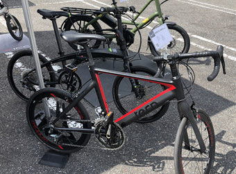ロードバイクのようにドロップハンドルが付いたミニベロ、いわゆるミニベロロードも複数台試乗。小径車ながらも走行性能の高いミニベロロードも魅力だが、乗り味はロードバイクとかなり似通った印象。ドロップハンドルに前傾姿勢で、ロード用のコンポーネントが使われ細いタイヤを履いていて…と、タイヤ径が小さい以外ほぼロードバイクと同じなので当たり前と言えば当たり前。しかし自分としてはそれではつまらない。ミニベロにはミニベロならではの個性が欲しい。という事で、実際に試乗してミニベロロードへの関心はすっかり無くなった。 |