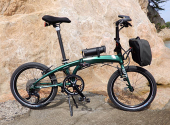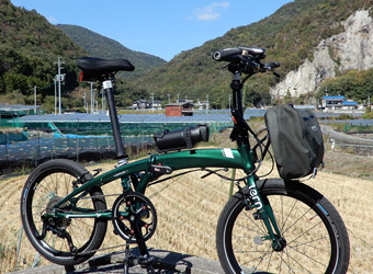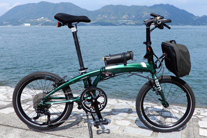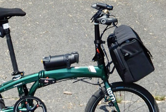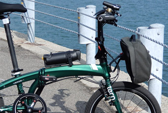 BROOKSのフロントバッグに変更して印象が変わった愛車の写真撮影が楽しい。TernのGo-To Bag装着時と比べて明らかにスタイリッシュな印象になり、オシャレでカッコよくなった。ただ、撮影した写真はどれもバッグの色味が実物と微妙に違う。本当はもっといい感じの深緑色なのに、写真だと少し灰色掛かった色味になりがち。写真では正確に表現されにくい色なのか、それともバッグの生地が関係しているのか、まぁこの程度は仕方ない。いちいちフォトレタッチソフトで色調補正するのも面倒なのでそのまま掲載。 |